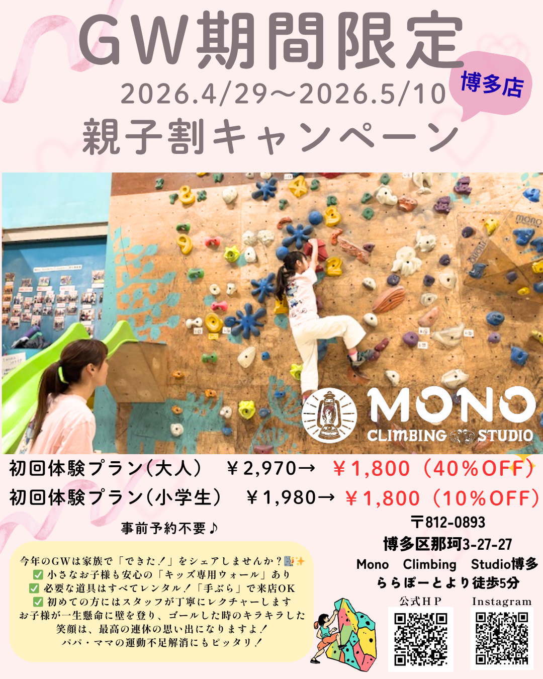 2026.4/29~2026.5/10 GW期間親子割キャンペーンを実施します♪