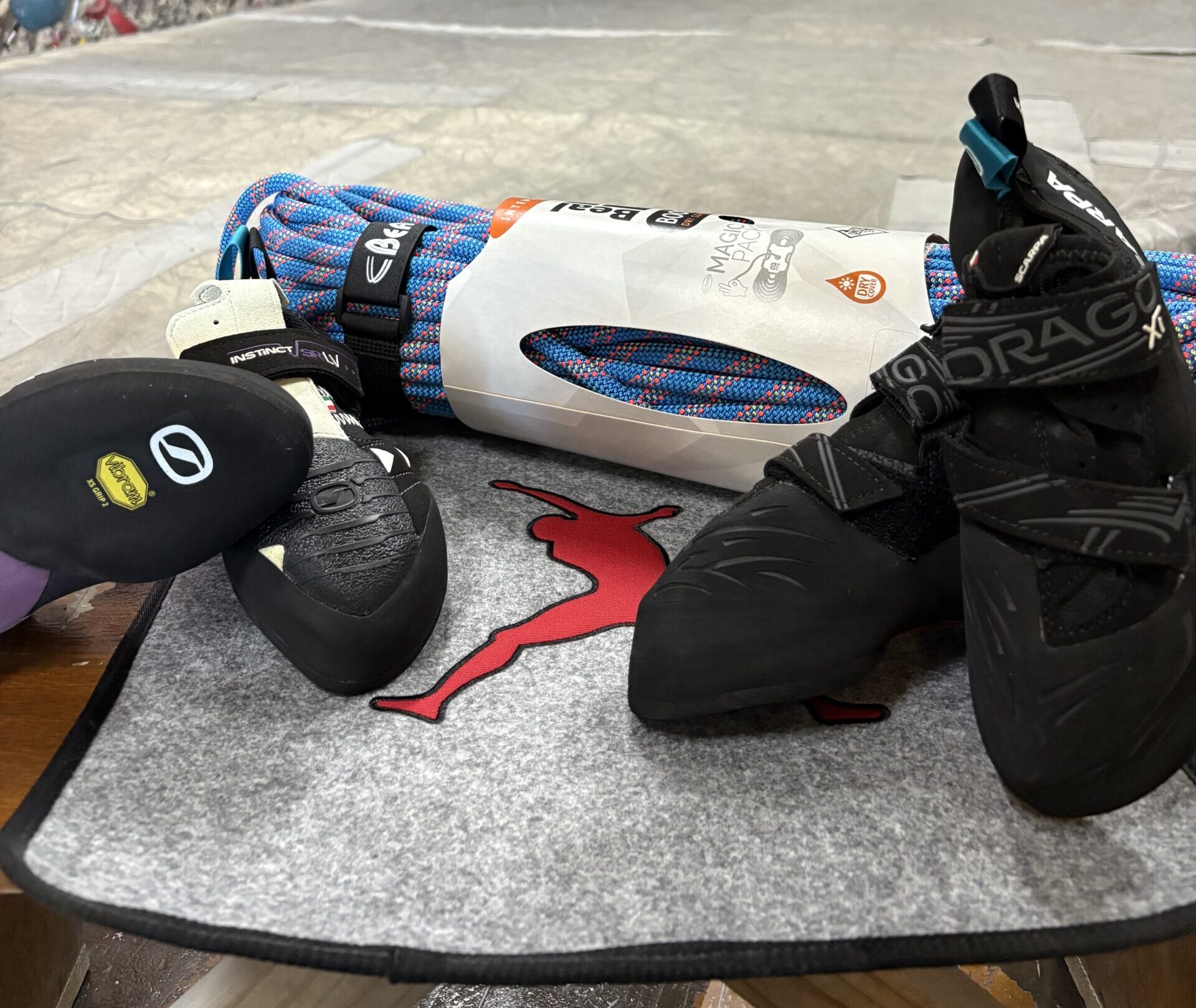大村店では、シューズ、ブラシ、チョークバッグ、マット、リード用品等