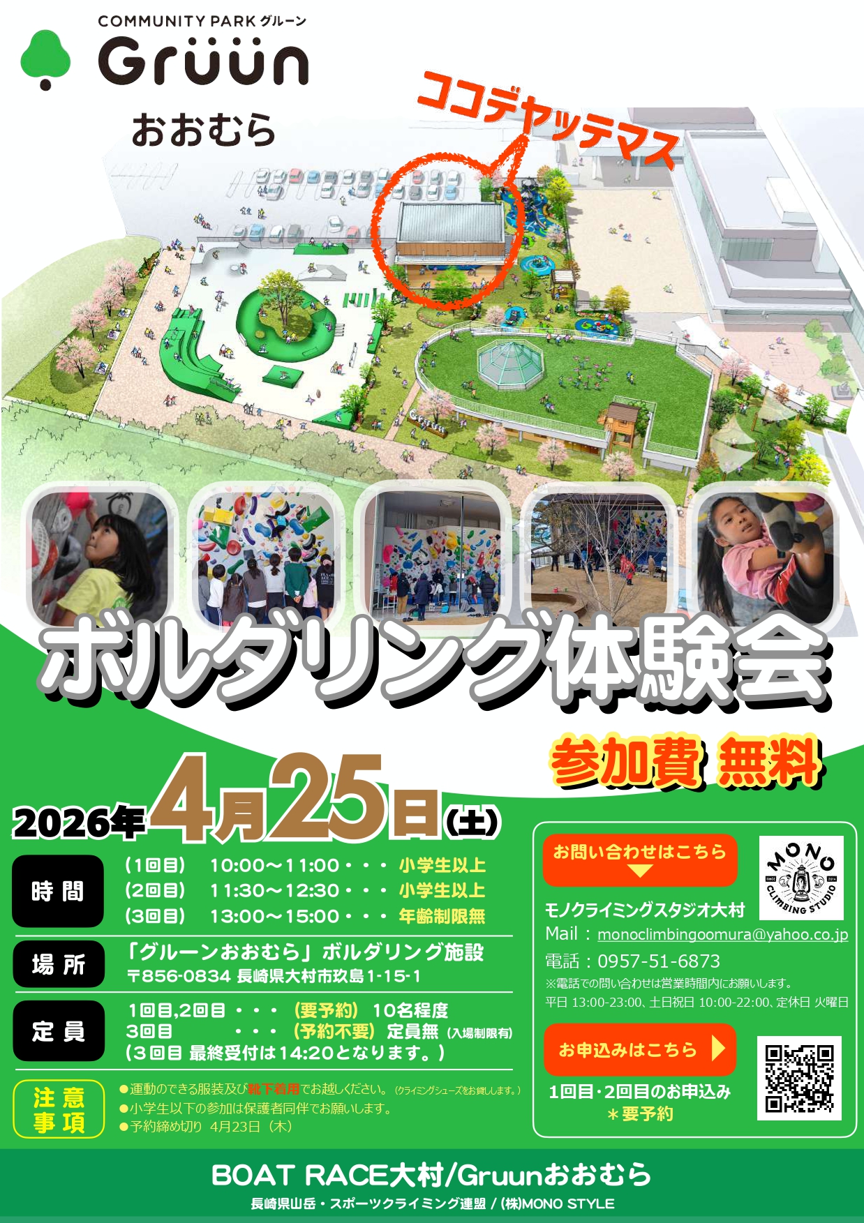 4/25(土)ボルダリング無料体験会@グルーンおおむら